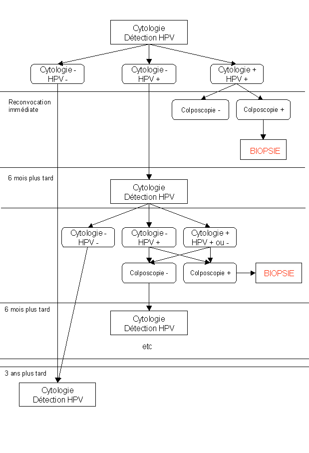 L’infection par les Papillomavirus (HPV) de type oncogène (types 16, 18, 31, 33, 35, 45, 46, ..) est une cause majeure de transformation de l’épithélium cervical et, elle est responsable en grande partie de la genèse des cancers cervicaux. En effet, on retrouve ces HPV à haut risque dans 99,8 % des carcinomes, la détection des HPV par une technique simple, sensible et automatisable pourrait donc améliorer de façon très significative la prévention de ce type de lésions. Mais, les HPV ne se développent pas en cultures cellulaires, ils ne sont détectables que par des techniques de biologie moléculaire (Hybridation, PCR). Par ailleurs le fait de les retrouver chez une patiente ne doit pas faire conclure à l’apparition certaine d’un cancer en l’absence de traitement, mais on sait que le risque d’apparition de ce type de cancer est alors multiplié par 10.